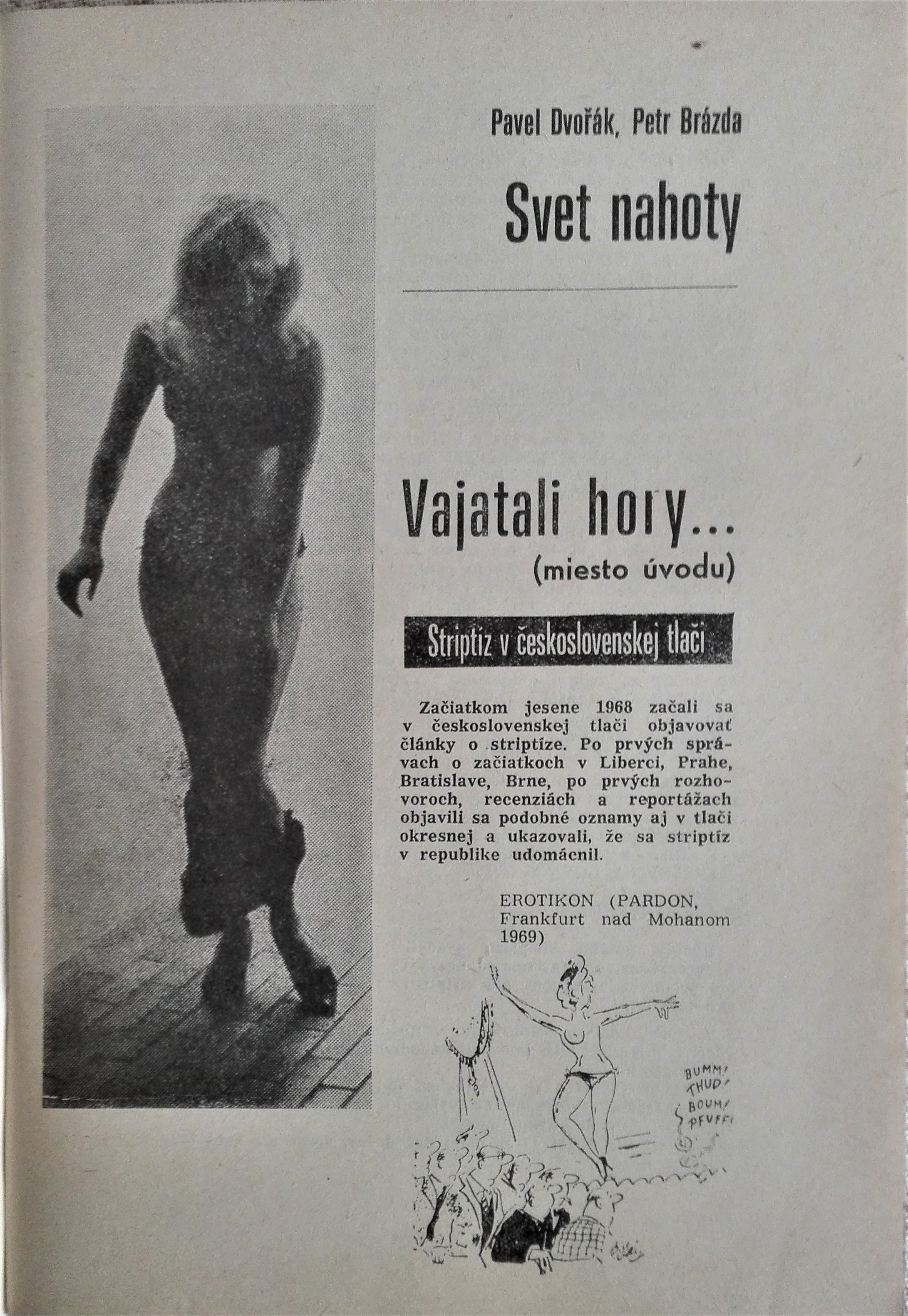 Rarita! V rámci "politického odmäku" začali v druhej polovici 60. rokov aj do socialistického Československa prenikať "západné" móresy a s nimi aj čiastočné odtabuizovanie sexu a erotiky. A tak sa k nám dostal aj striptíz, ako súčasť varietných programov nočných podnikov vo viacerých mestách republiky, vrátane niekdajšej legendárnej bratislavskej Perugie na Zelenej ulici (dnes Gazdovský dvor). Autori publikácie - jedným z nich je Pavel Dvořák (1937-2018), neskôr populárny historik a spisovateľ - na tento "fenomén" zareagovali samostatnou knihou. Tá okrem reportážnej formy, približujúcej najznámejšie podniky tohto druhu v Československu, prináša aj zaujímavý pohľad na historické korene striptízu v ľudských dejinách, ale aj sexualitu, erotiku, prípadne pornografiu všeobecne a ich "prítomnosť" v kultúre a umení, vrátane ich neustáleho zápasu s mravokárcami a cenzúrou. Autorské texty Pavla Dvořáka sú v slovenskom jazyku, Brázdove v českom.